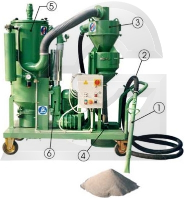 Carro com filtro, bomba vácuo, ciclone, crivador, seleccionador, deposito, mangueira e boquilha.