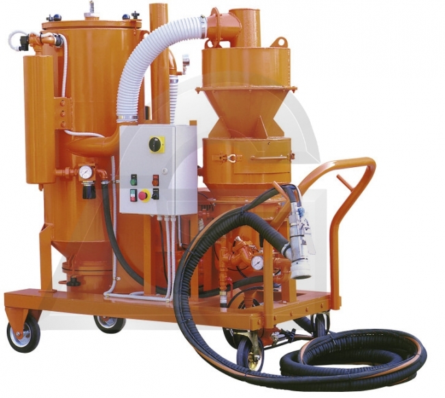 Atravès dum tubo anti-abrasivo flexível, o abrasivo aspirado entra no ciclone, é seleccionado, limpo de escórias e resíduos e pronto a ser utilizado de novo.
